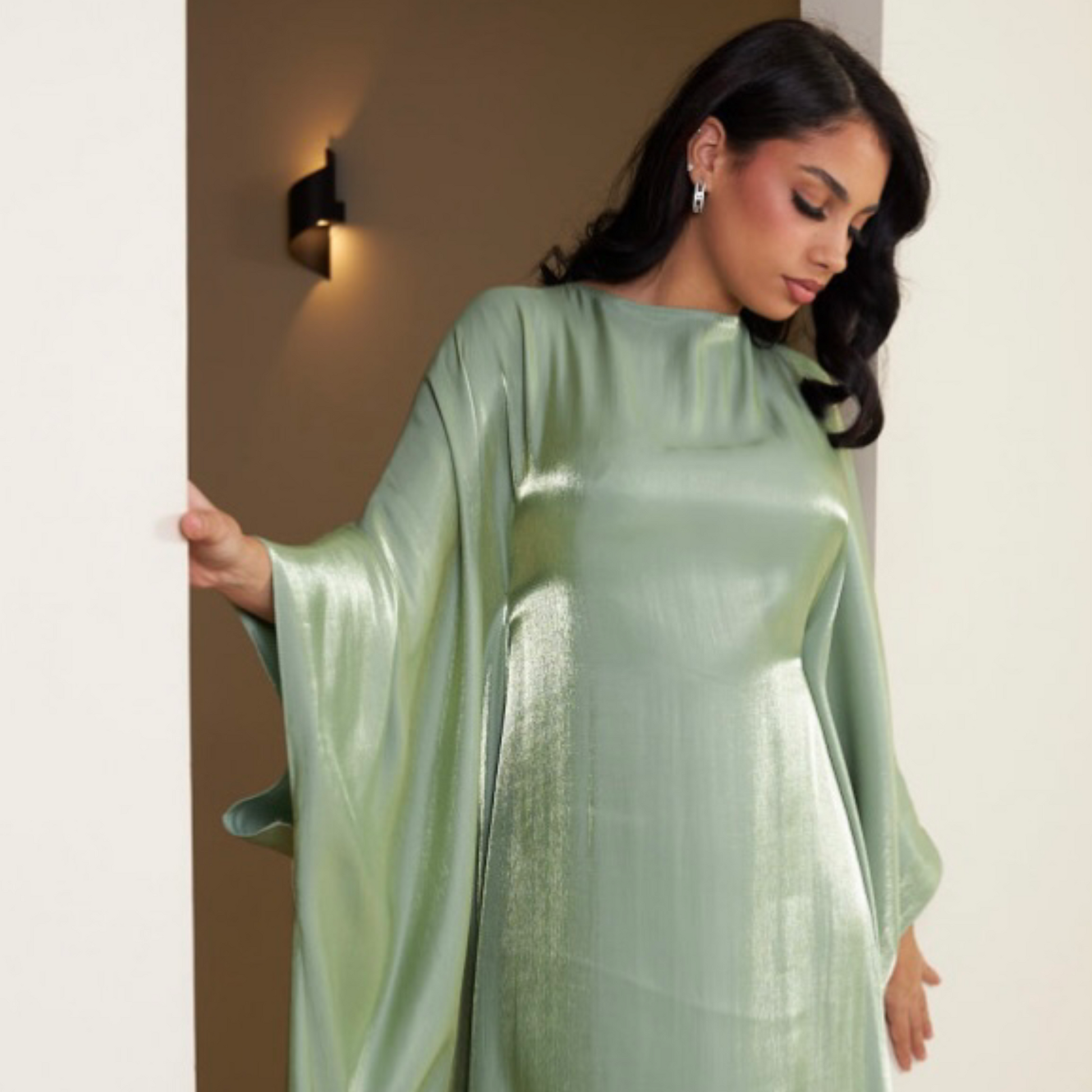 Model height is 5'7 and is wearing size Regular for the Kaftan and S/M for the Underlayer Satin Dress